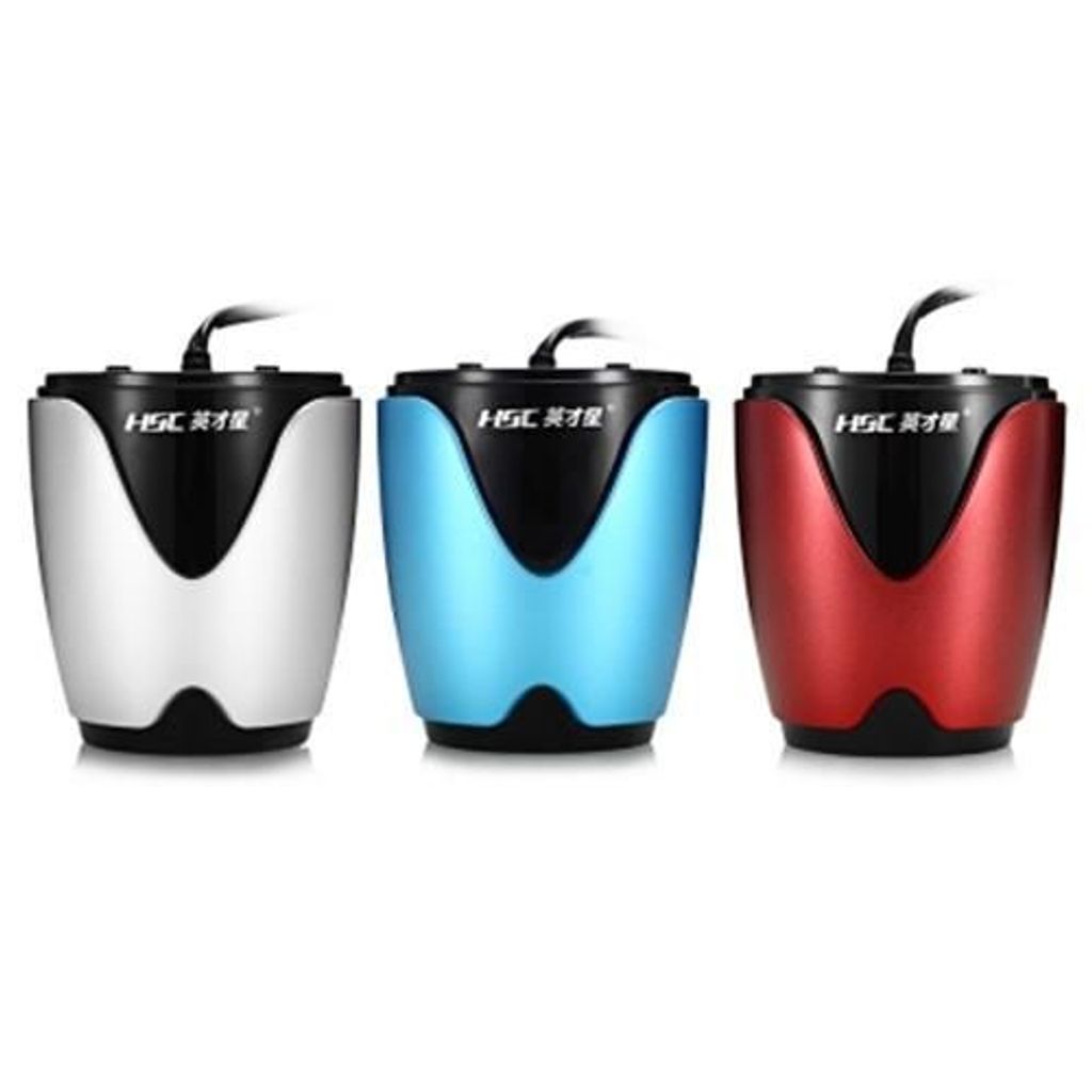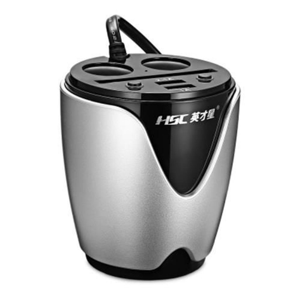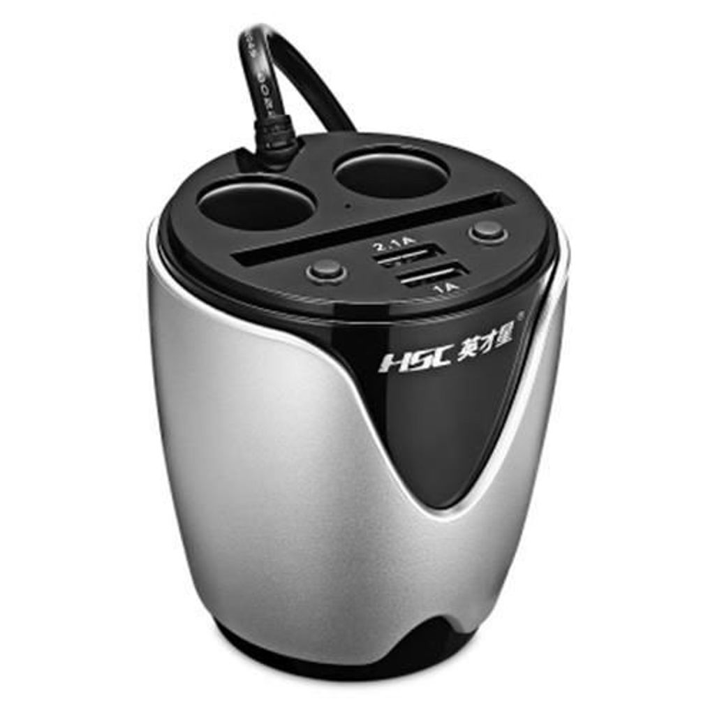 HSC 200B Car Charger Cup Shape / Dual USB / 3 Cigarette Lighter Sockets / Card Slot