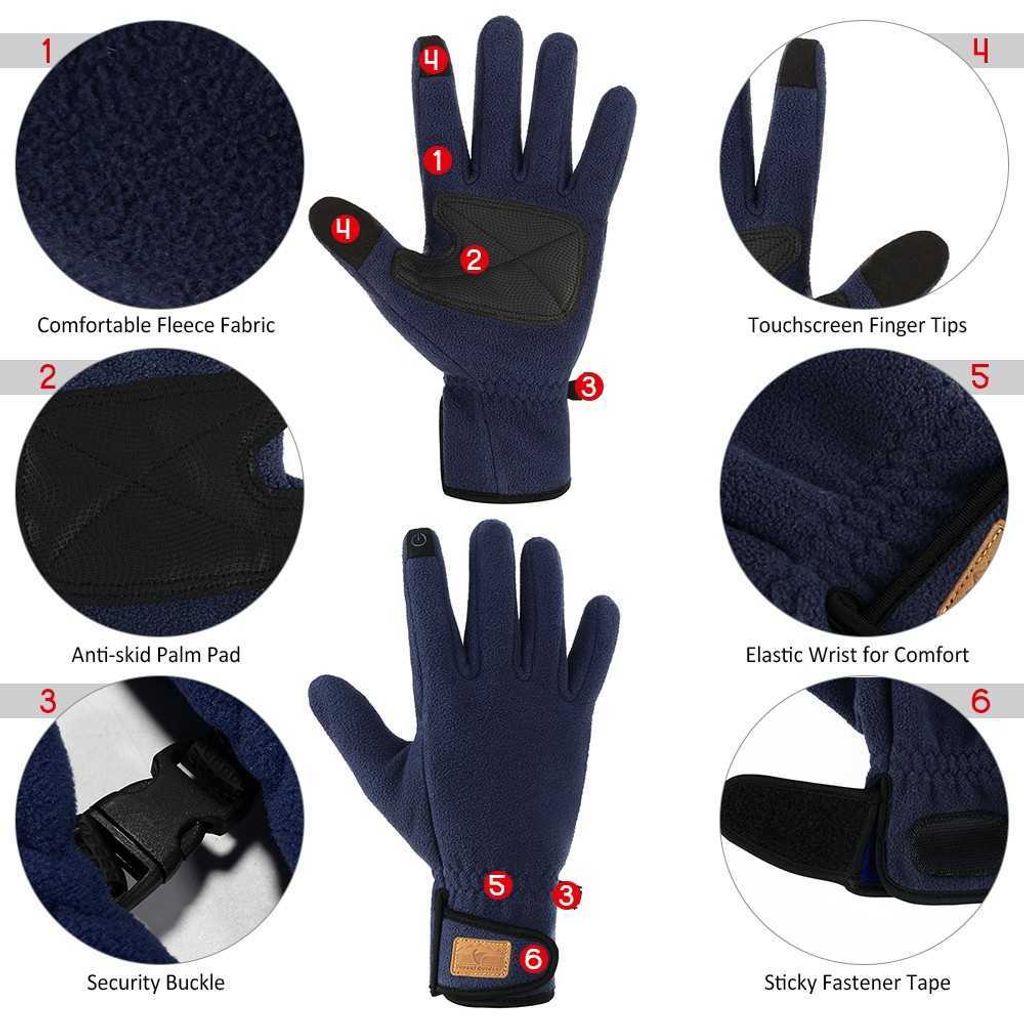 The gloves are made of top-quality fleece which can keep you warm and comfortable. The touchscreen compatible fingertips allow you to use your smartphone conveniently. It is great for winter sports like skiing, snowboarding, cycling.