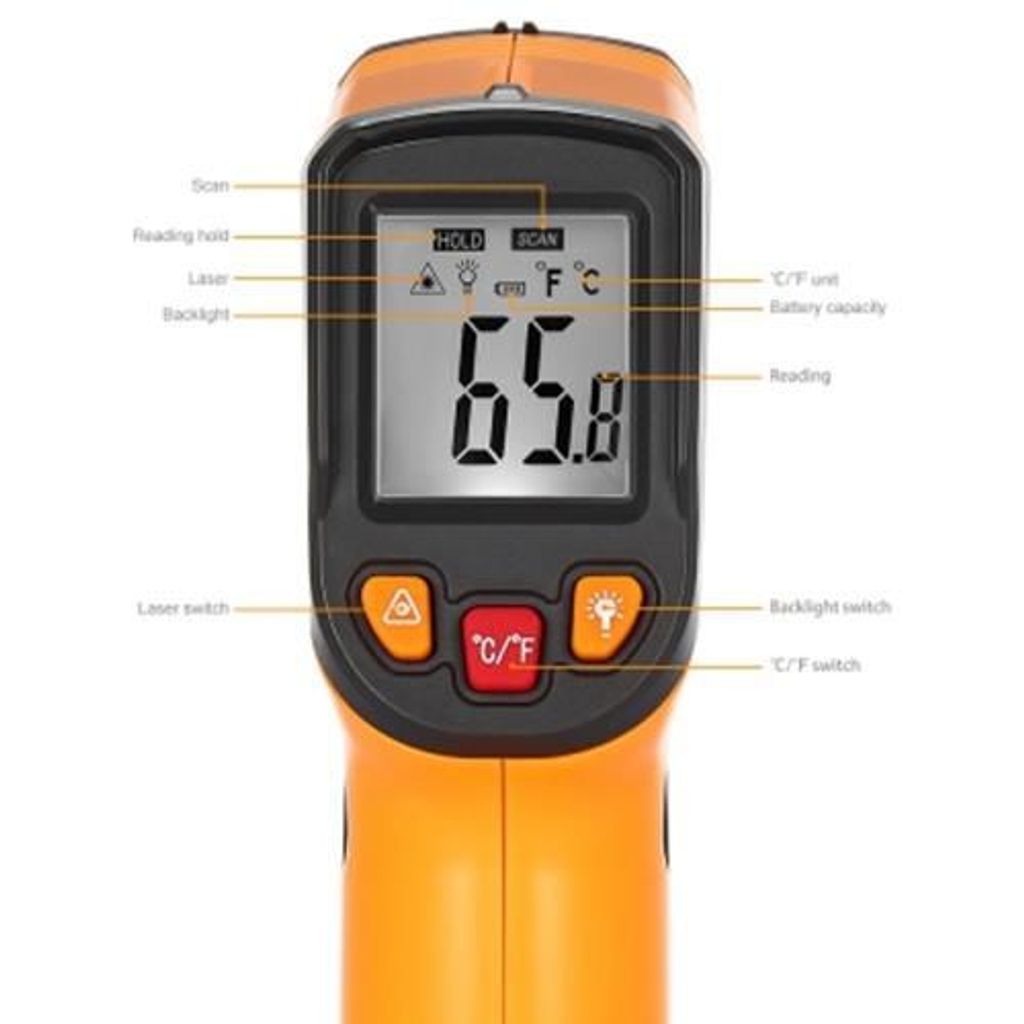 - Quick and efficient: you just press the trigger and let the laser point to the object to be measured, it will show the temperature accurately with very short response time