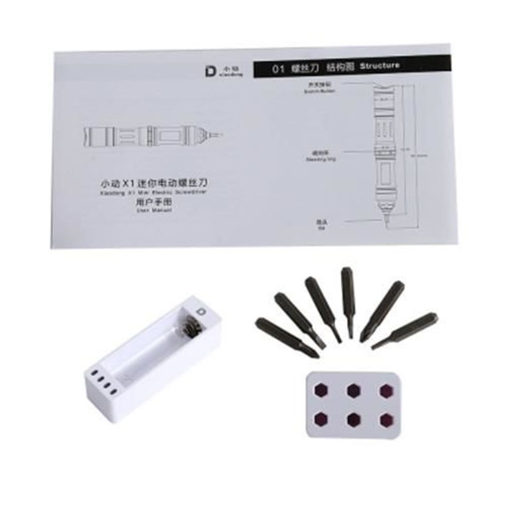 Package Contents: 1 x Rechargeable Mini Electric Screwdriver, 1 x USB Charger, 1 x Batch Head Block, 6 x Bit, 1 x User Manual in English and Chinese
