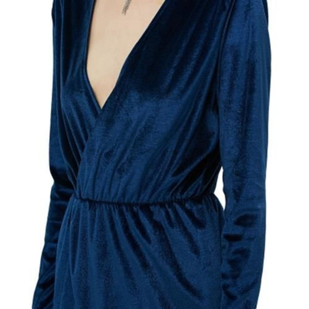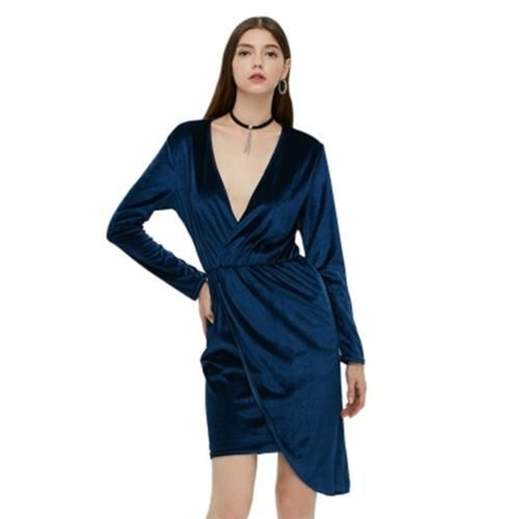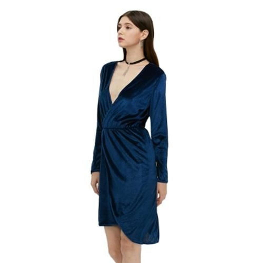 BRIEF LONG SLEEVE PLUNGING NECK ASYMMETRICAL HEM WOMEN DRESS (PURPLISH BLUE)