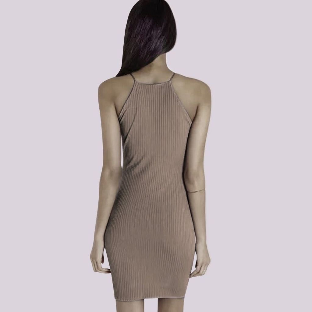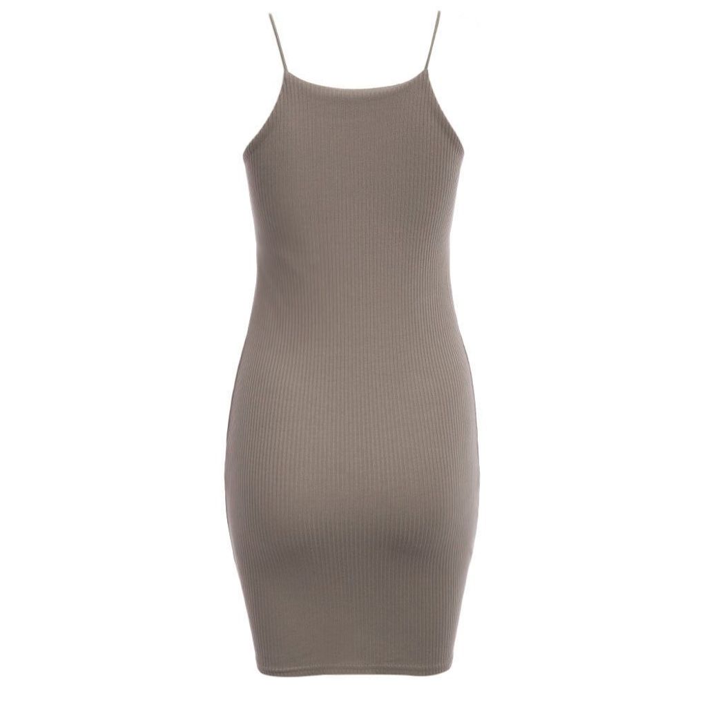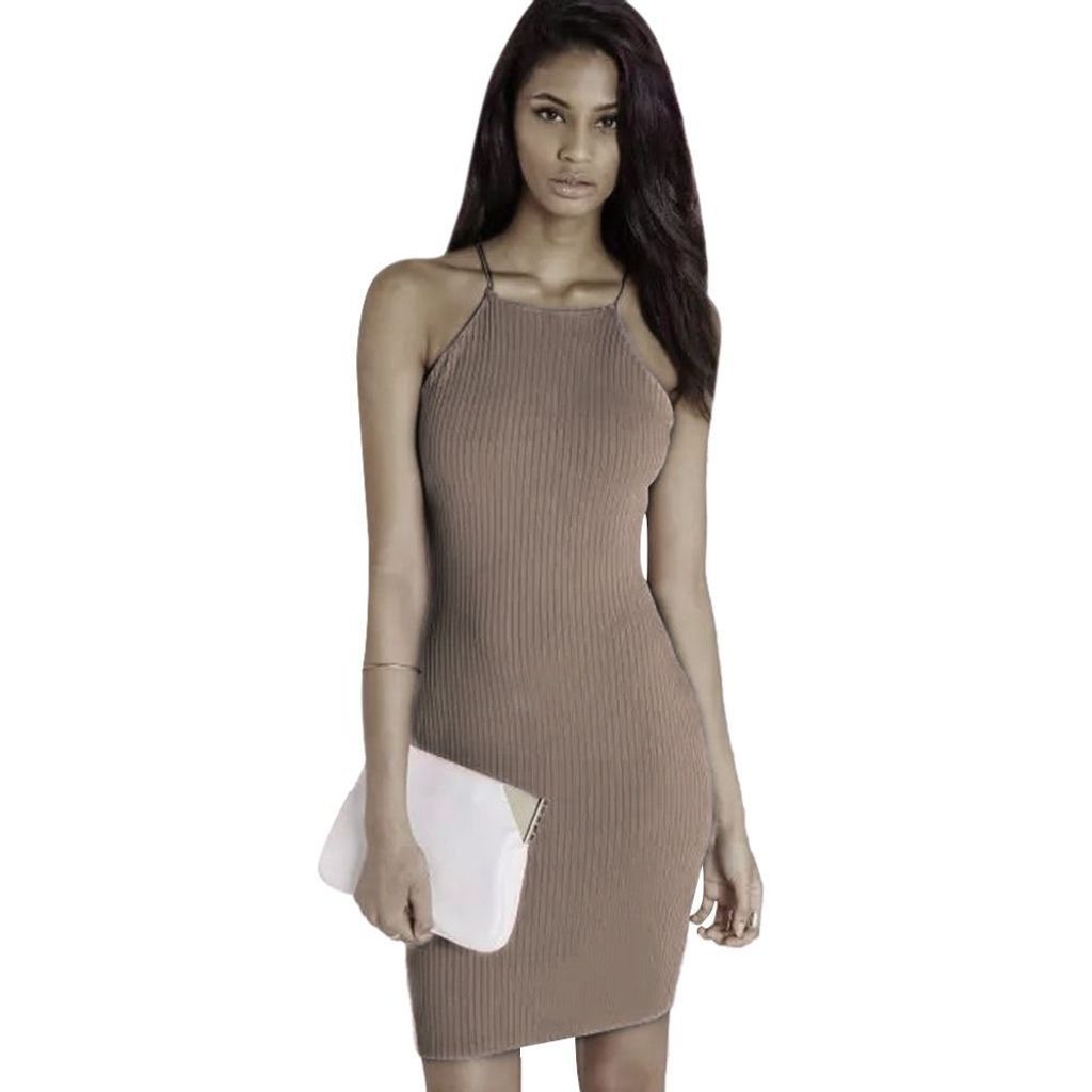 CHARMING SPAGHETTI STRAP BODYCON KNIT MINI DRESS (KHAKI S/M)
