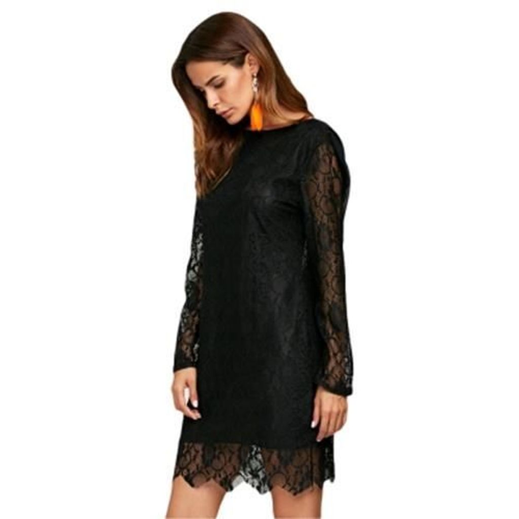 CHIC ROUND COLLAR SEE-THROUGH LACE BLACK DRESS FOR WOMEN (BLACK)
