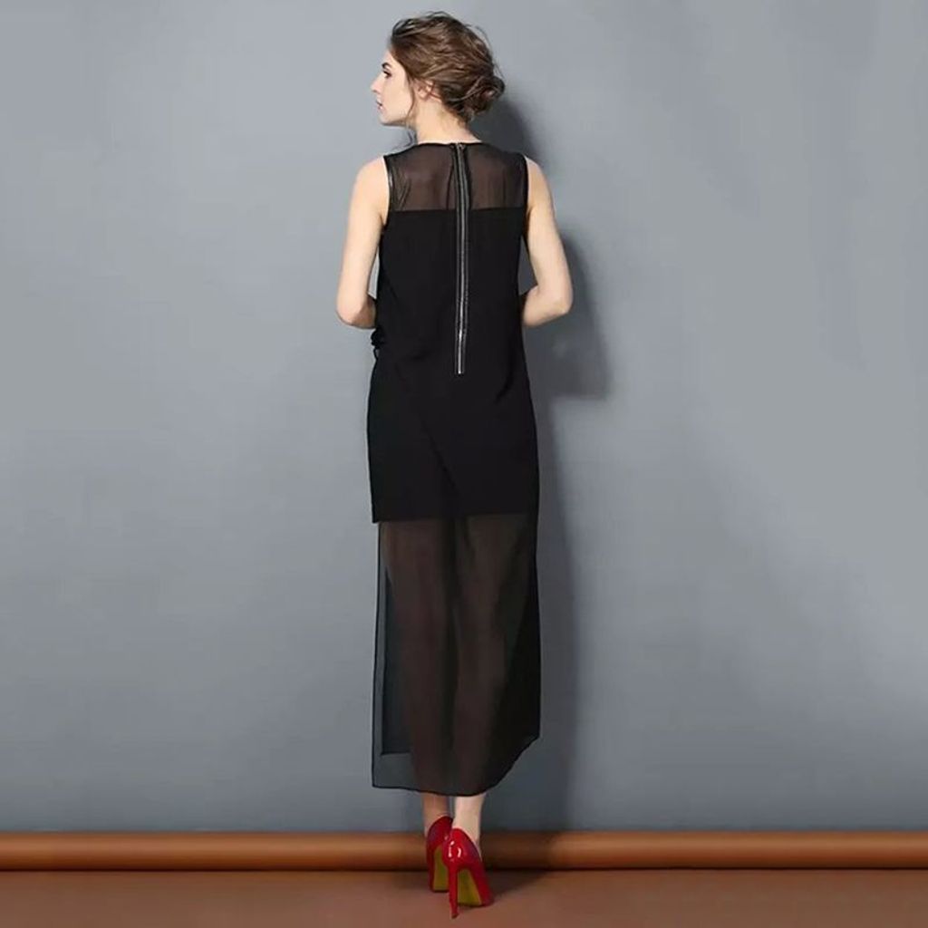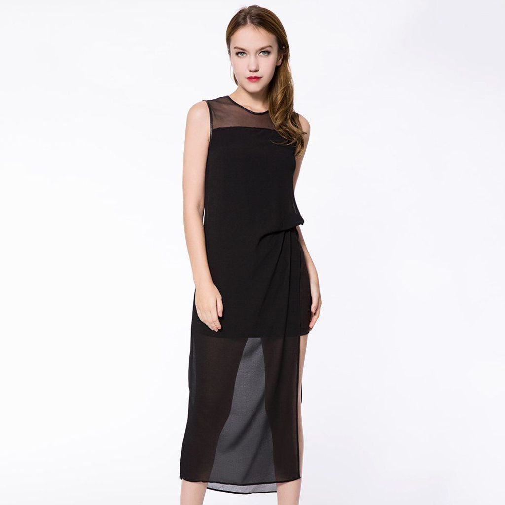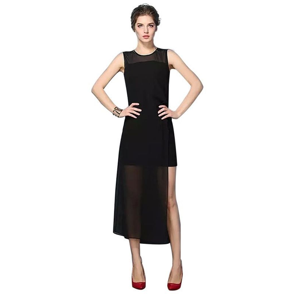 ELEGANT ROUND COLLAR SLEEVELESS SPLICED FAUX TWO PIECE PURE COLOR WOMEN'S SPLIT DRESS