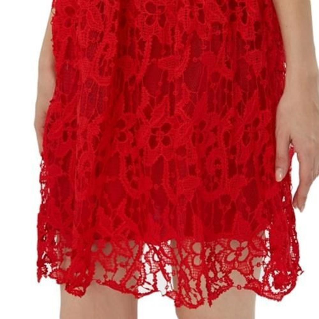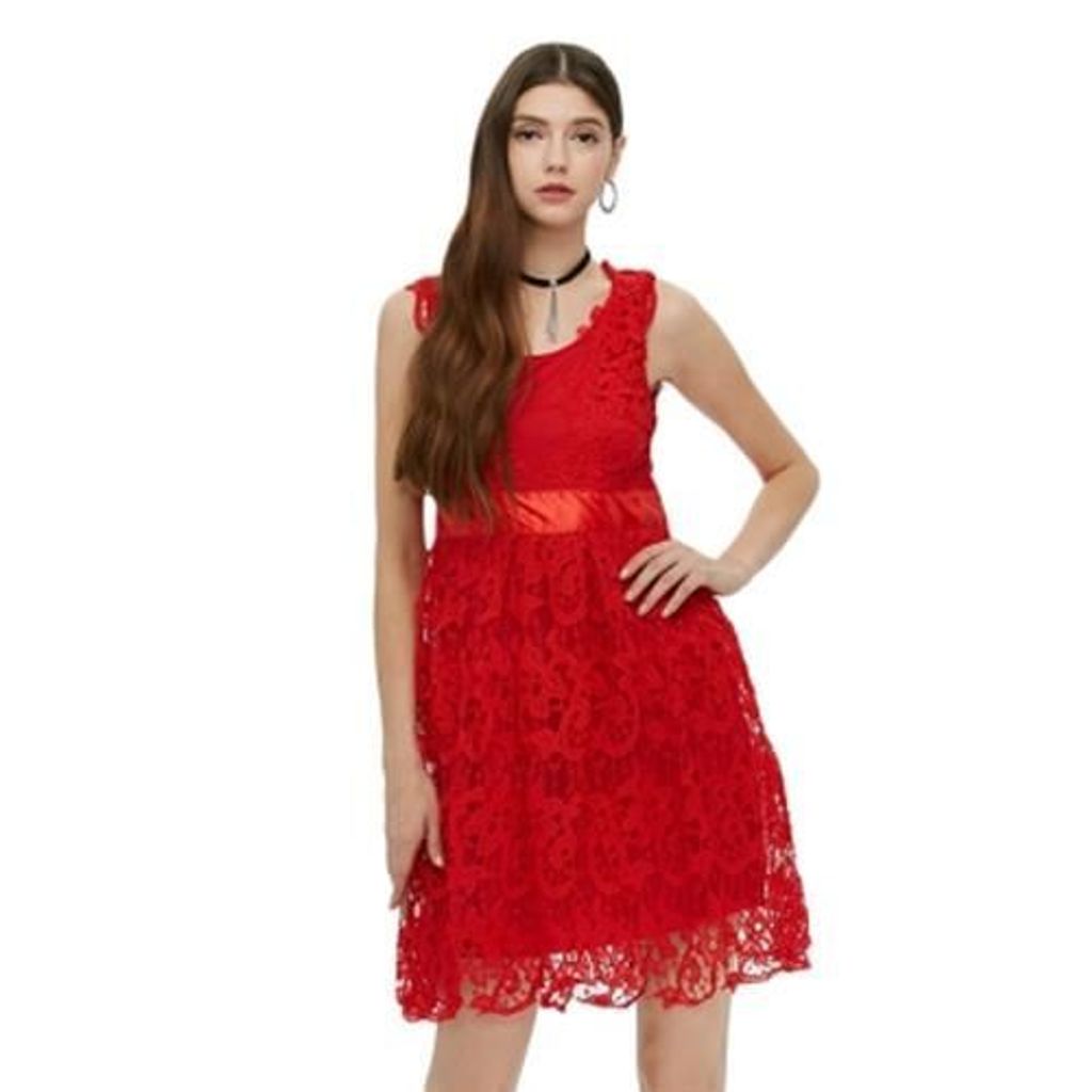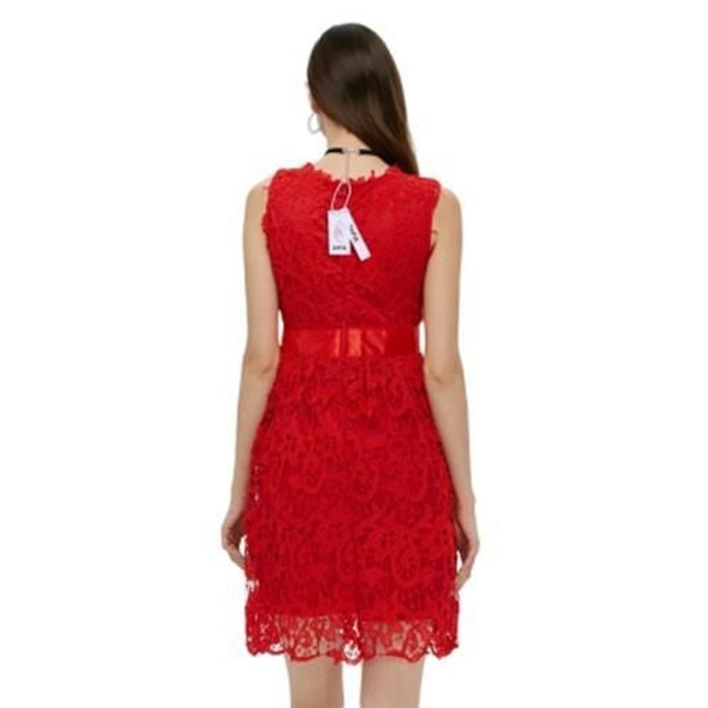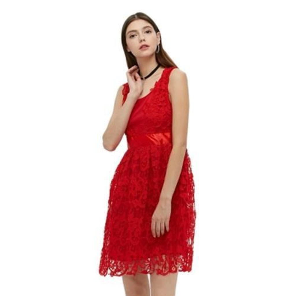 ELEGANT SLEEVELESS ROUND NECK RED FLORAL LACE WOMEN DRESS (RED)