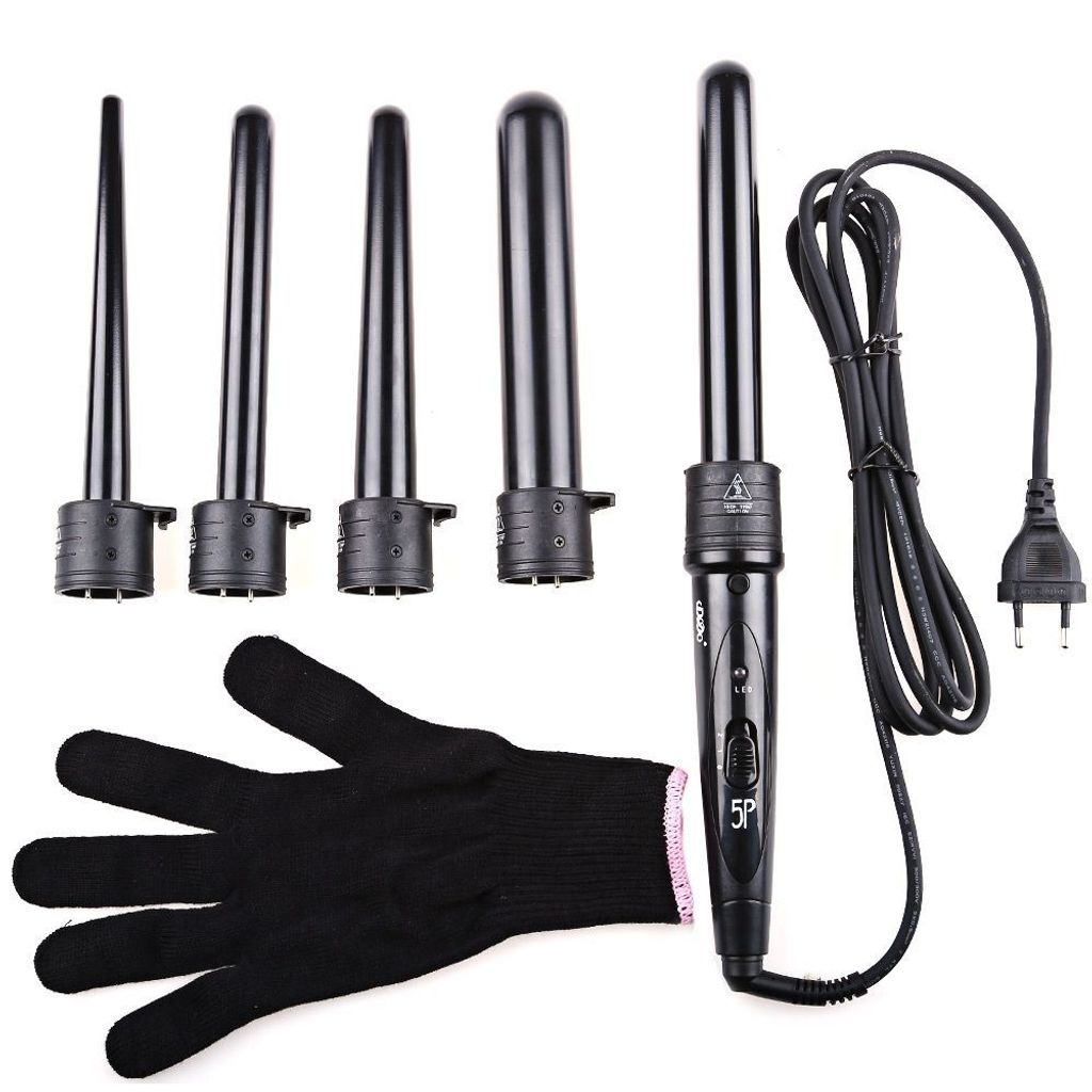 PRO SALON 5-IN-1 INTERCHANGEABLE HAIR CURLING IRON MULTI-SIZE ROLLER HEAT RESISTANT GLOVE STYLING SET (BLACK, EU PLUG)