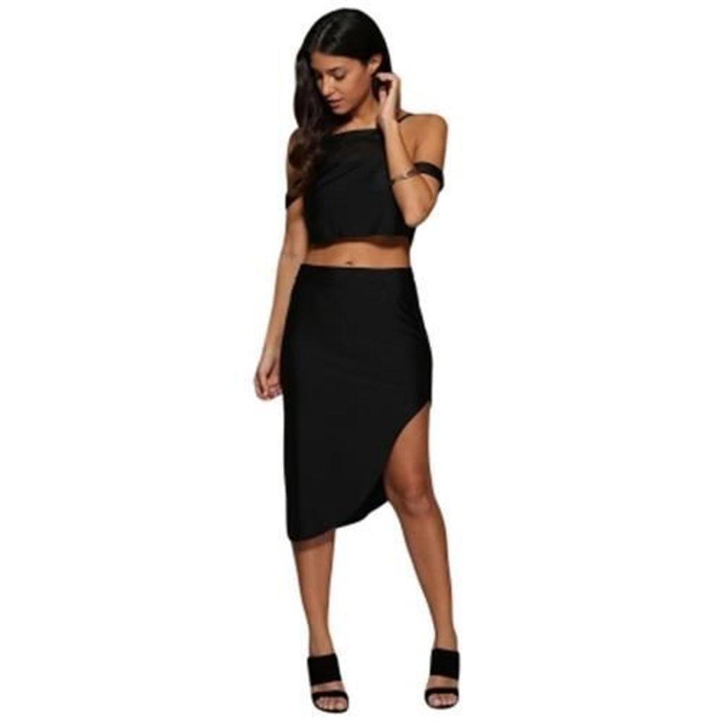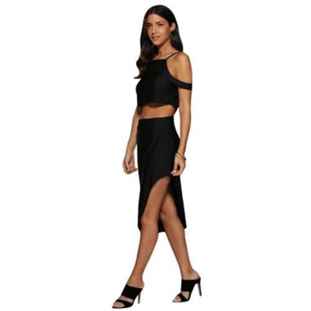 SEXY COLD SHOULDER MID WAIST ASYMMETRICAL TWO PIECE DRESS FOR WOMEN (BLACK)
