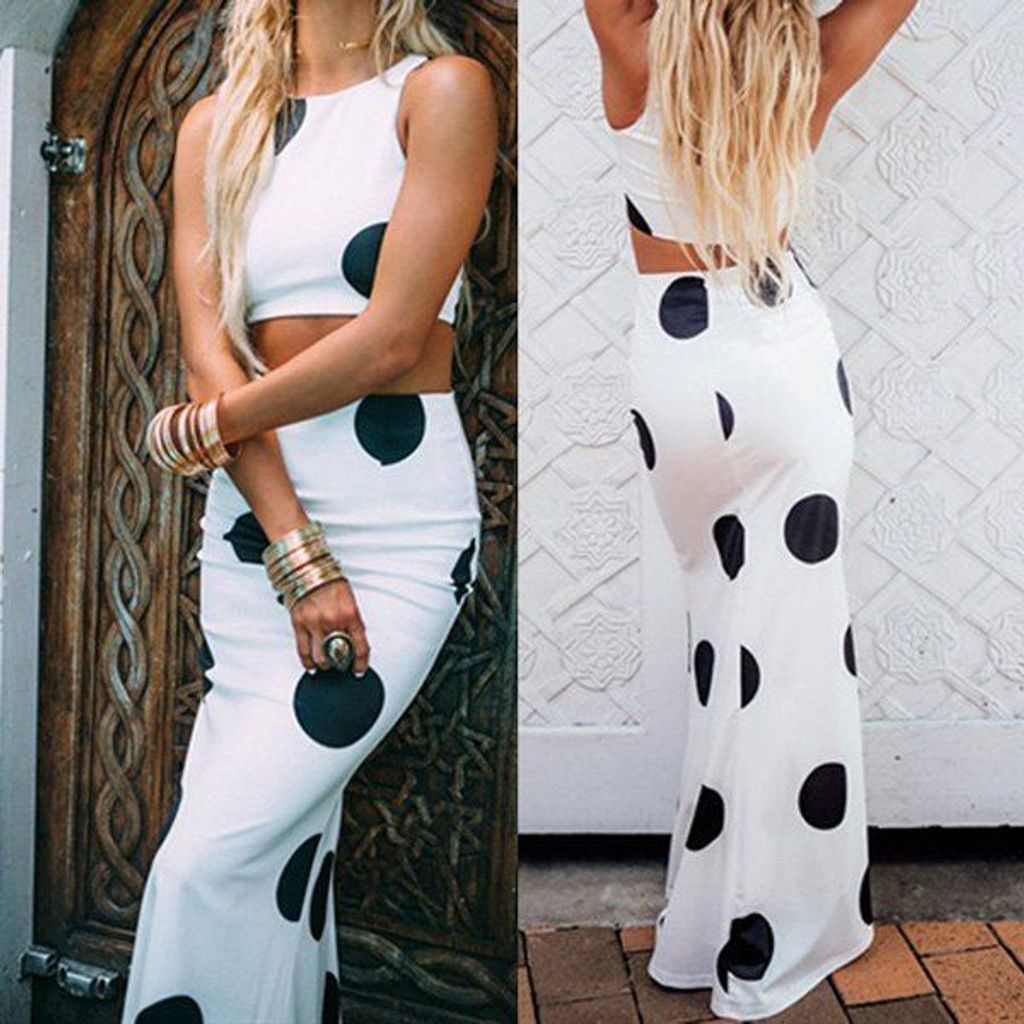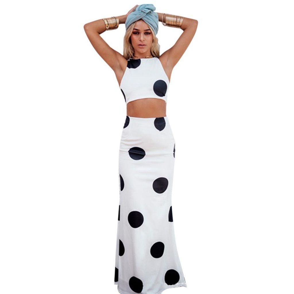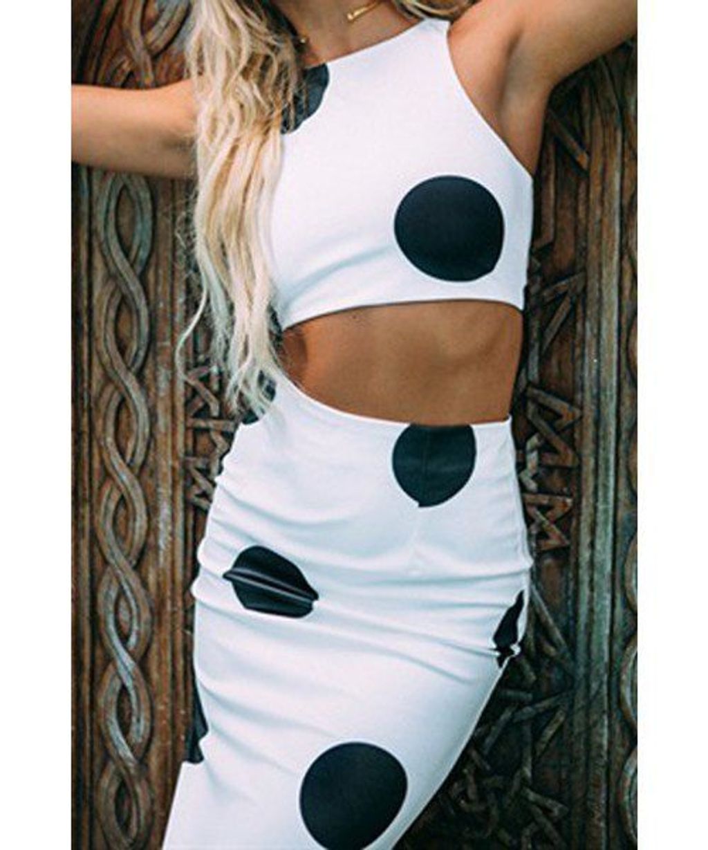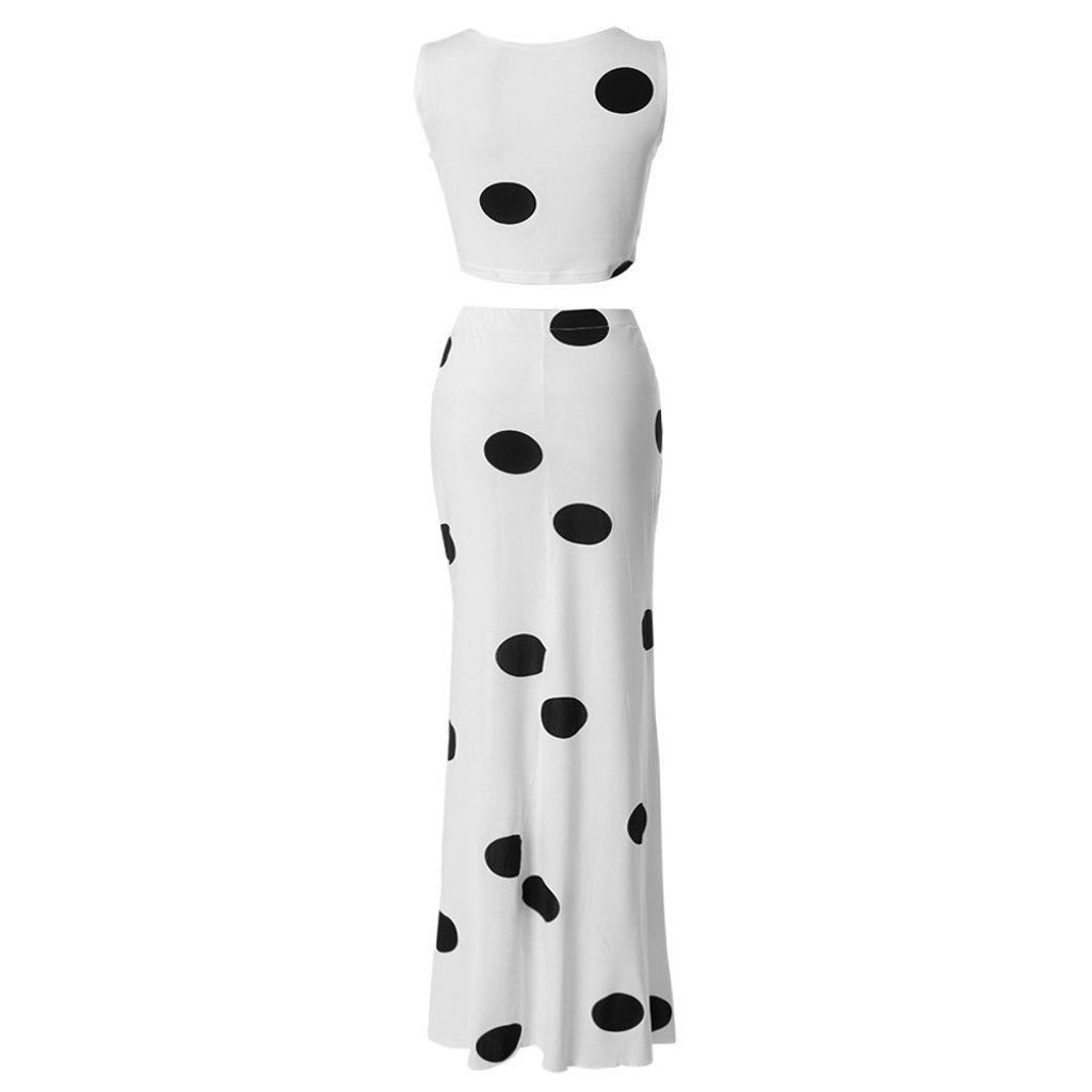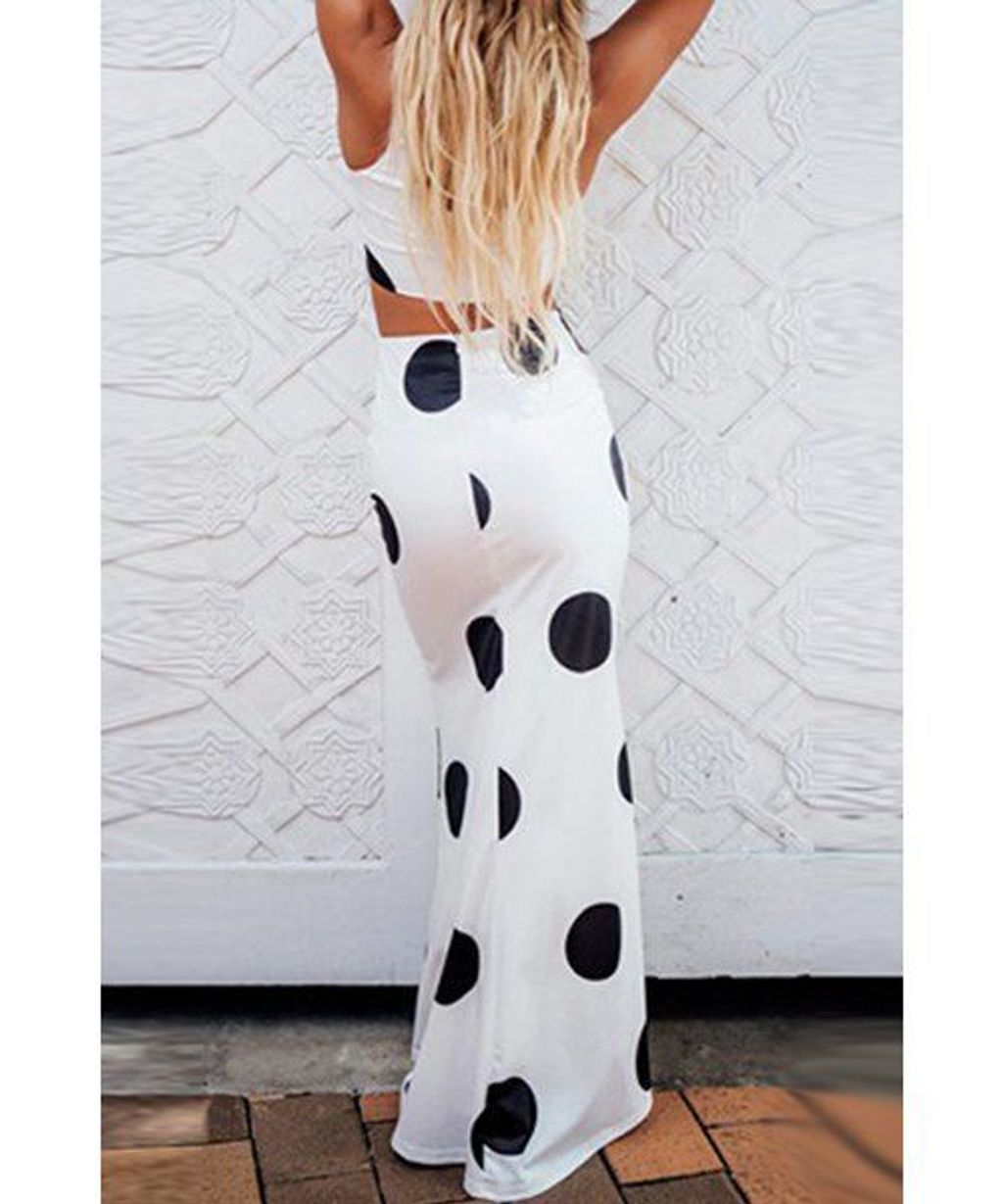 Sexy Round Neck Sleeveless Polka Dot Crop Top and Maxi Skirt Suit For Women