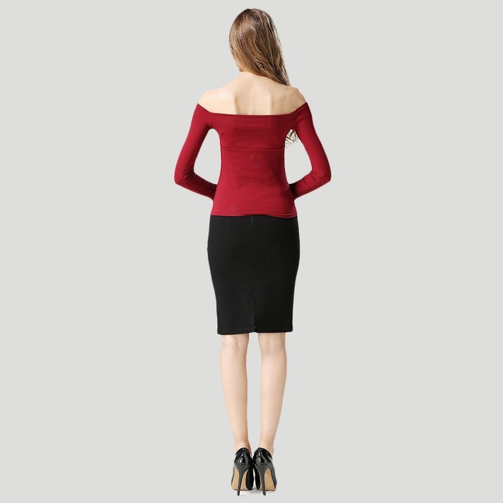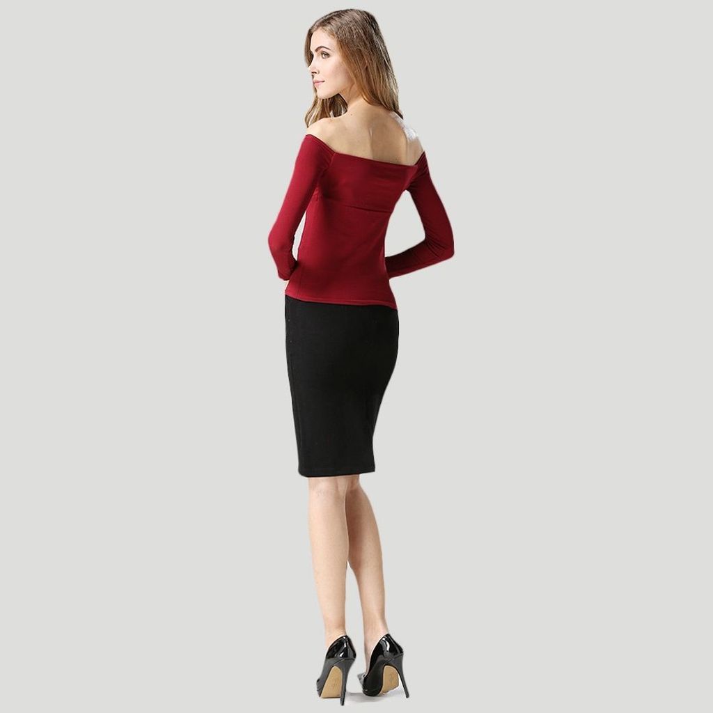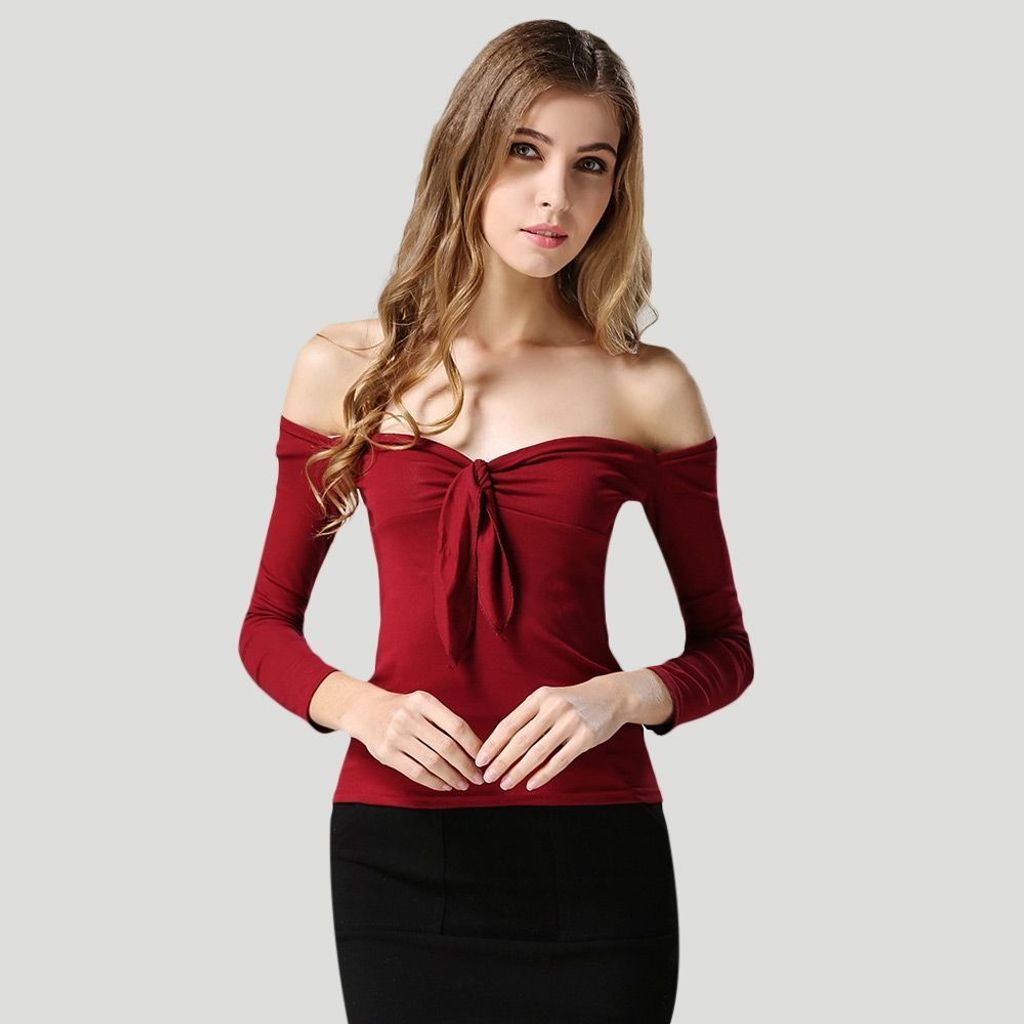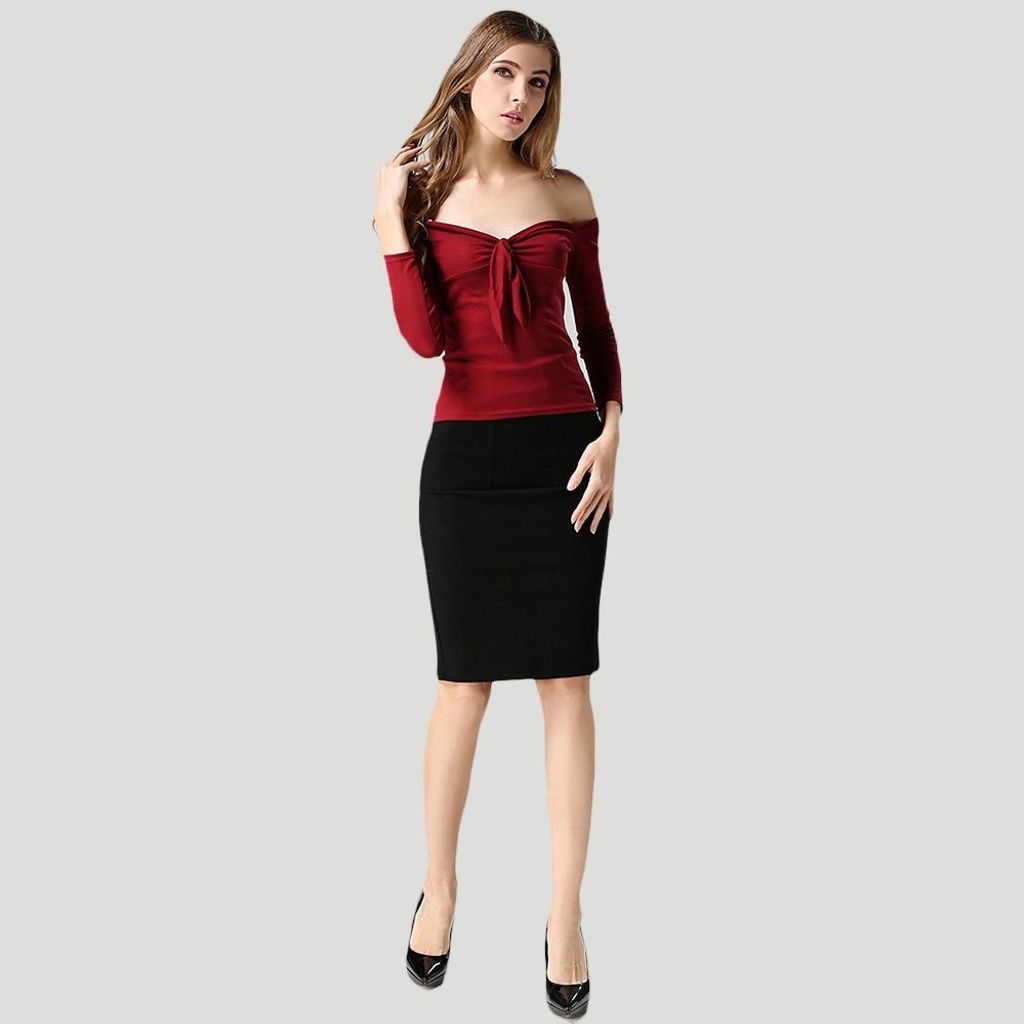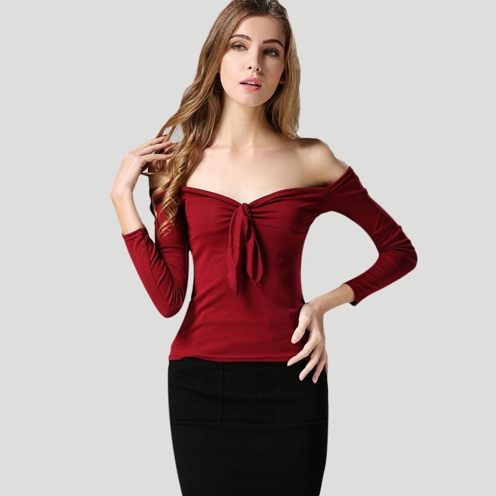 WOMEN'S OFF THE SHOULDER CHEST KNOT SLIM T-SHIRT (WINE RED, SIZE M/L)