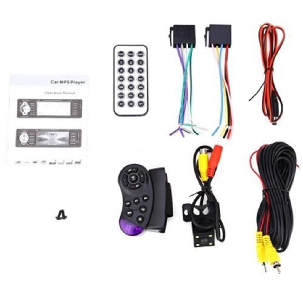 Package Contents: 1 x Car MP5 Player, 1 x English User Manual, 1 x Camera, 2 x Remote Control, 4 x Cable, 2 x Screw