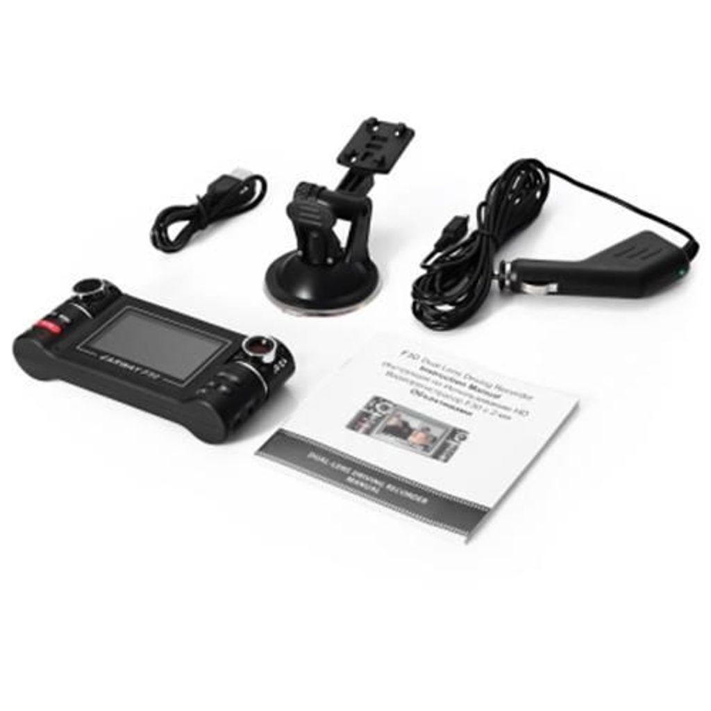 Package Contents: 1 x F30 Driving Recorder, 1 x Car Charger, 1 x USB Cable, 1 x Holder, 1 x Trilingual User Manual in Russian, English and Chinese