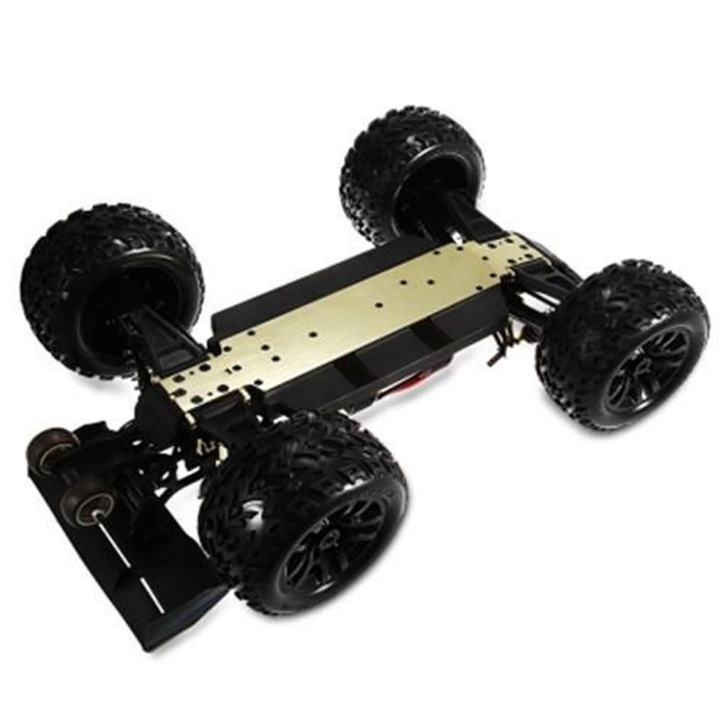 The chassis is reinforced by a thick metal plate, and the huge shock absorbers around firmly support it.