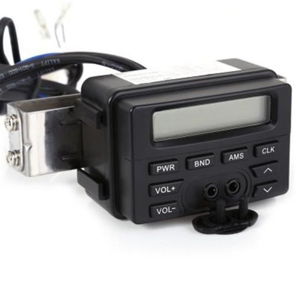 Package Contents: 1 x Handlebar Mount Radio Head Unit, 1 x 3.5mm AUX Cable, 1x Male Plug Housing, 1 x English Manual