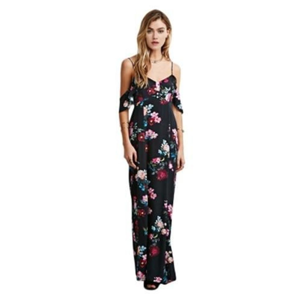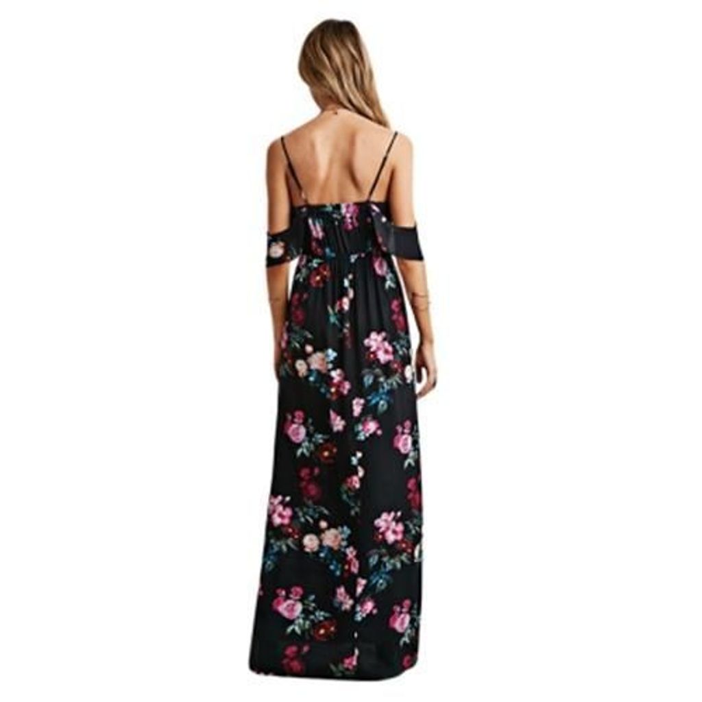STYLISH SPAGHETTI STRAP BACKLESS FLORAL PRINT WOMEN DRESS (BLACK)