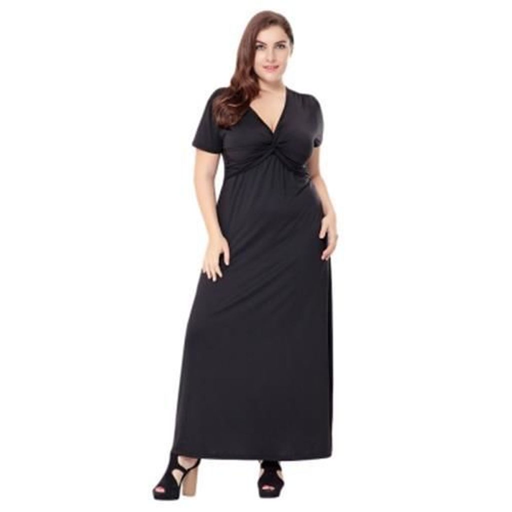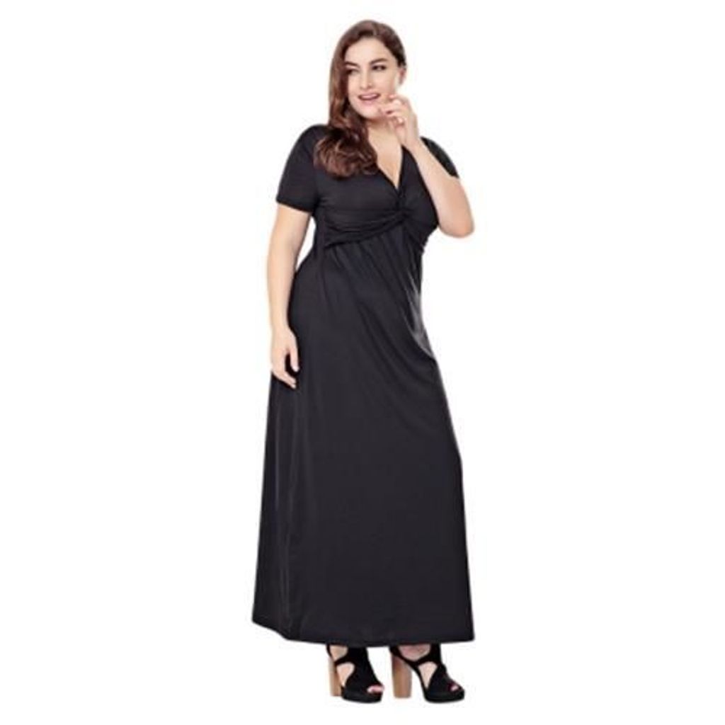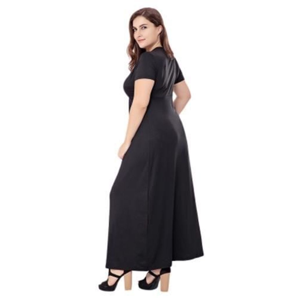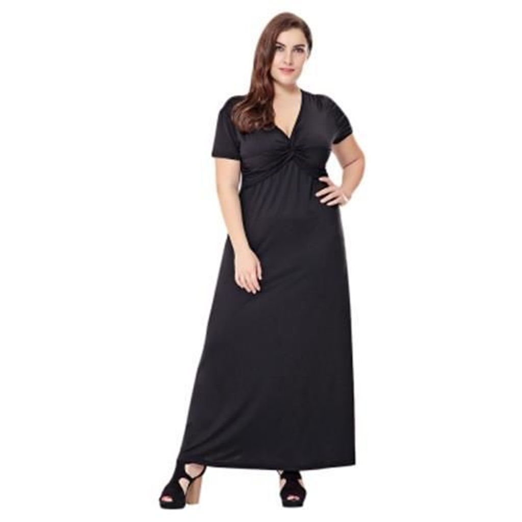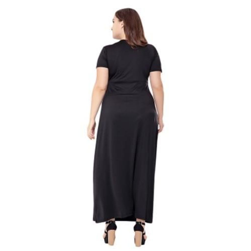 TRENDY PLUNGE NECK SHORT SLEEVE PLUS SIZE WOMEN MAXI DRESS (BLACK)