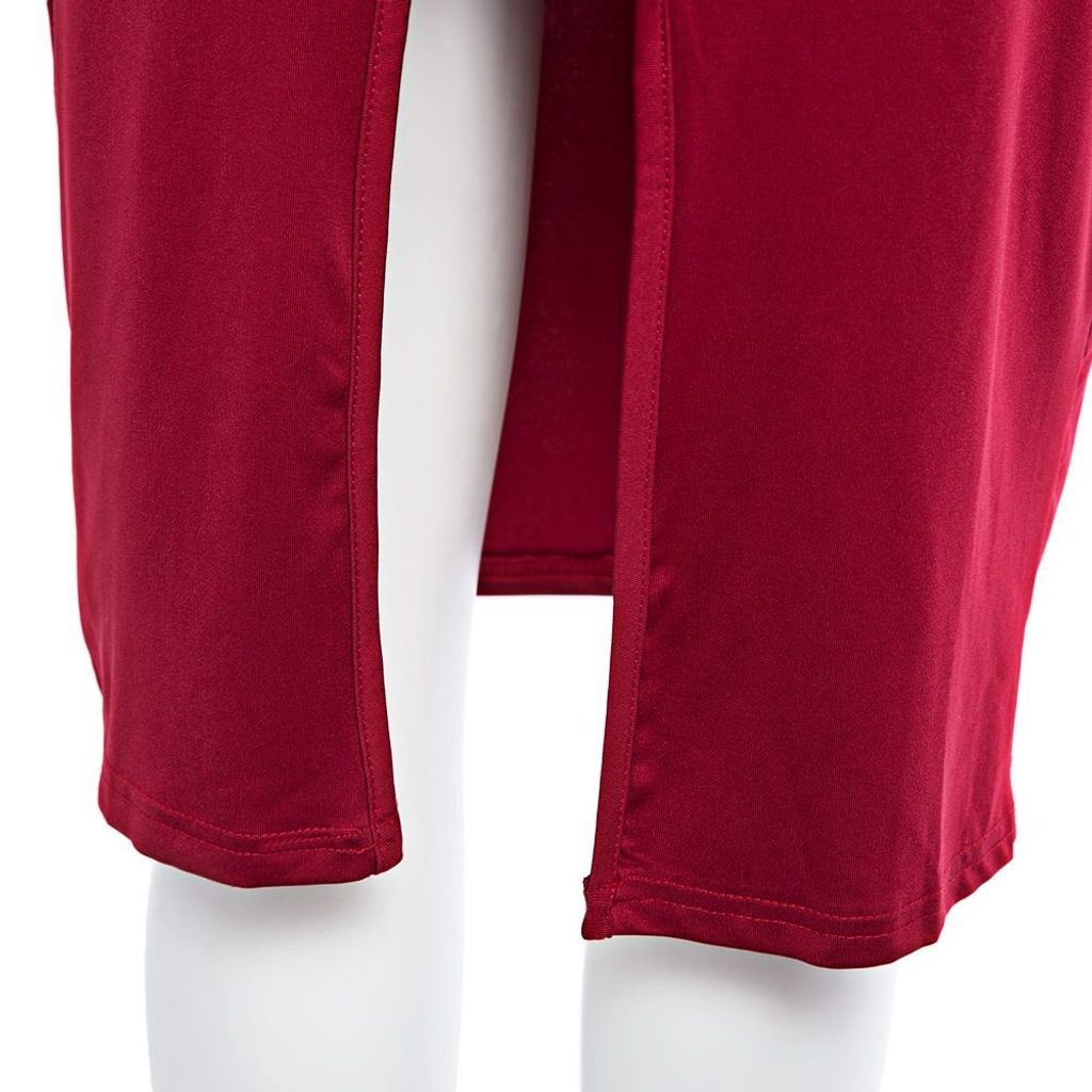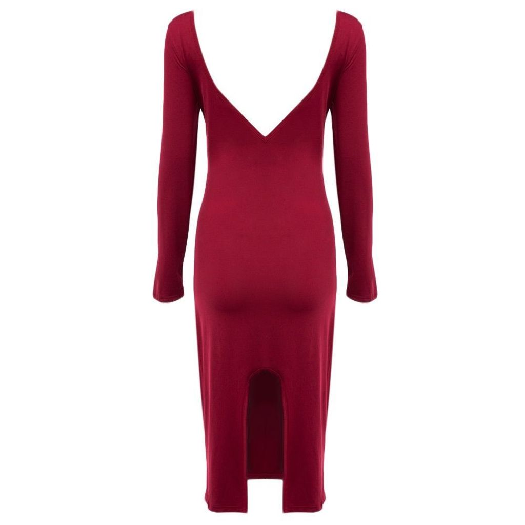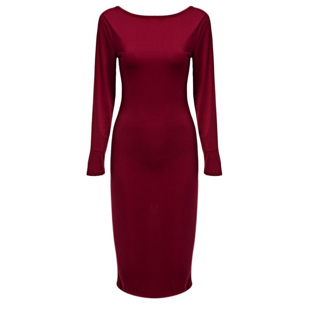 WOMEN'S LONG SLEEVE ROUND COLLAR BACKLESS BODYCON SLIT DRESS (WINE RED, SIZE S/M/L/XL)