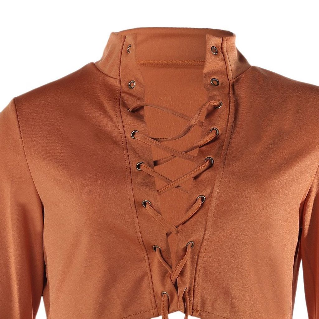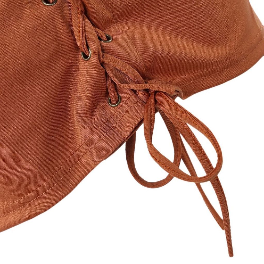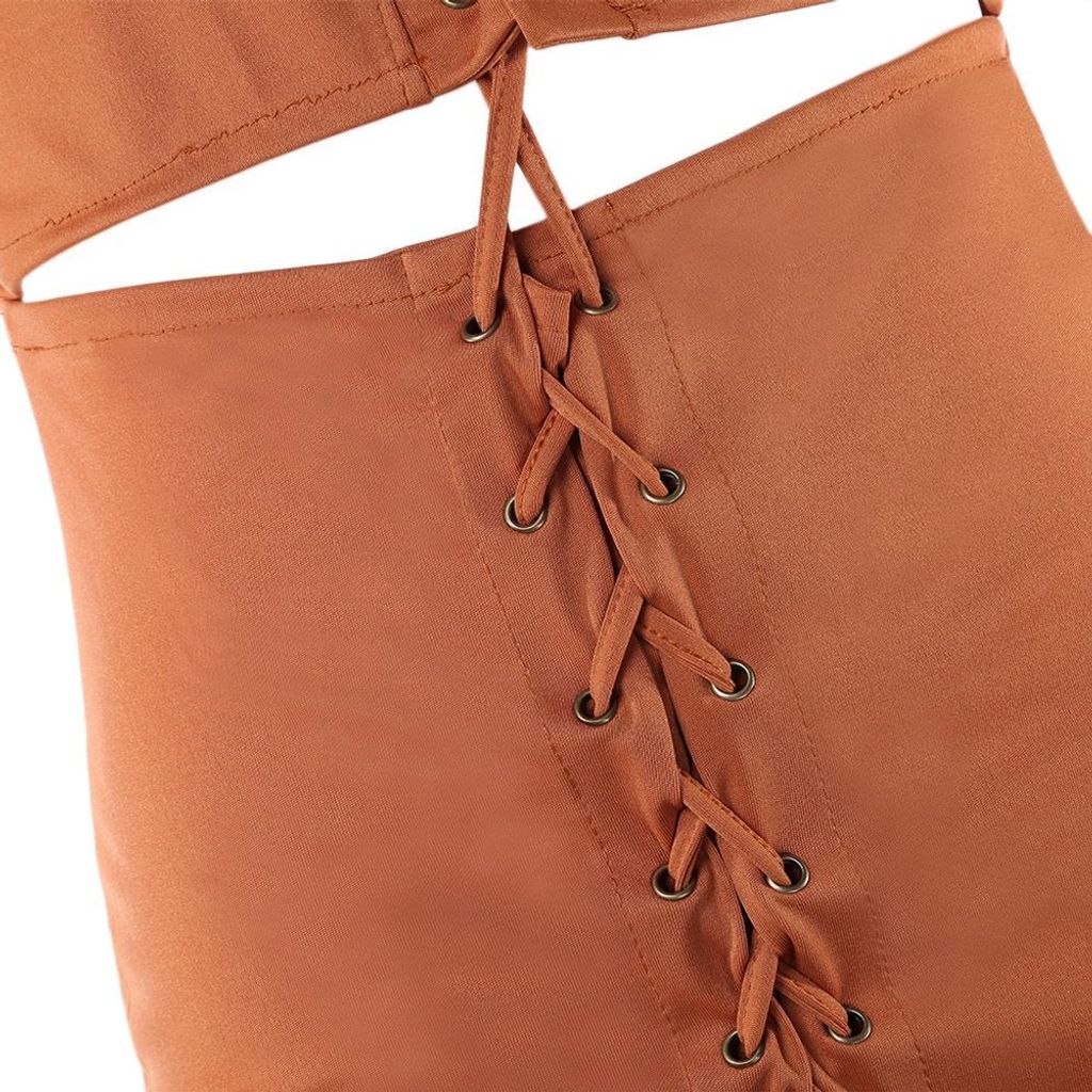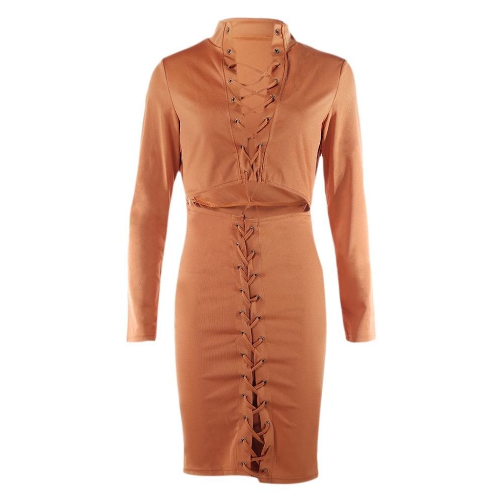 WOMEN'S SOLID EYELETS NAVEL STAND NECK SKINNY CRISS-CROSS STRINGS DRESS (TEA-COLOURED, SIZE S/M/L/XL)